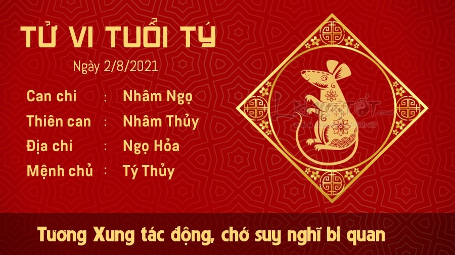 Tuổi Tý thường xuyên cảm thấy căng thẳng và mệt mỏi vào ngày hôm nay do Tương Xung tác động. Hãy tìm cách loại bỏ những suy nghĩ tiêu cực, bi quan nếu muốn công việc được tiến hành suôn sẻ và nhanh chóng hơn. Trong chuyện tình cảm, người độc thân có thể nhận được sự quan tâm đến từ một vài đối tượng khác giới, song bạn nên dành thời gian tiếp tục tìm hiểu đối phương chứ chớ nên vội vàng tin tưởng vào lời ngon tiếng ngọt đến với người đó ngay lập tức. Kiếp Tài cho thấy bạn là người thẳng thắn, mạnh mẽ trong công việc, bạn có thể bắt tay vào công việc mà không cần sự ủng hộ của bất cứ ai. Tuy nhiên, đừng vì thế mà trở thành một người cứng đầu cứng cổ, không biết tiếp thu ý kiến.