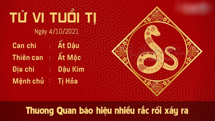Thương Quan báo hiệu nhiều rắc rối sẽ xảy ra với người tuổi Tị trong ngày hôm nay. Bản mệnh có thể vướng phải mâu thuẫn, bất đồng ý kiến với lãnh đạo, khiến công việc gặp trục trặc. Tuy vậy, bạn cũng không nên suy nghĩ quá bi quan. Trước khi oán trách người khác, bản mệnh cũng cần phải xét lại chính bản thân mình để nhận ra rằng mình cần phải thay đổi những tính xấu nào, cải thiện những điểm yếu nào. Quá trình tự kiểm điểm này cũng giúp bạn tiến bộ nhanh chóng hơn. Hỏa khắc Kim còn cho thấy con giáp này thường hay nổi nóng với nửa kia của mình một cách vô lý. Nếu cảm thấy khó chịu trong lòng, bạn hãy nhẹ nhàng tâm sự với người ấy để đôi bên có thể cùng nhau giải quyết vấn đề.