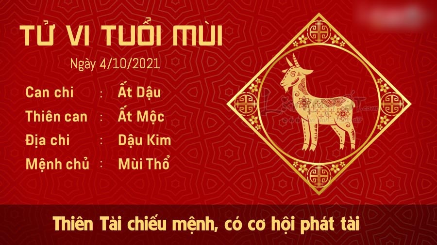 Thiên Tài chiếu mệnh, người tuổi Mùi có cơ hội phát tài trong ngày hôm nay, đặc biệt là với những ai làm việc tự do. Bạn chắc chắn sẽ nhận được phần thưởng xứng đáng nếu đã chăm chỉ làm thêm trong suốt thời gian qua. Bản mệnh là người thông minh, nhạy bén và cũng rất phóng khoáng với mọi người, tuy nhiên, tật xấu của bạn là hay ba hoa, khoác lác. Đừng quá kiêu ngạo như vậy, hãy khiêm tốn hơn để nhận ra và học hỏi những điều hay từ mọi người. Thổ sinh Kim, mối quan hệ của bạn với gia đình rất hòa hợp. Bạn luôn là một người biết chăm lo cho mái ấm của mình, dù là người bận rộn đến mấy. Bạn trân trọng tình thân vì hiểu rằng đó là thứ tình cảm vô giá mà không gì có thể đánh đổi được.