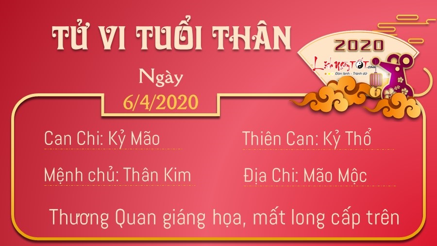 Thương Quan giáng họa, người tuổi Thân vốn là con giáp thông minh, tài hoa nhưng lại hiếu thắng, làm việc theo cảm hứng, không có kế hoạch cụ thể, điều này khiến bạn thường không hoàn thành được nhiệm vụ được giao, dễ mất lòng lãnh đạo. Hãy có trách nhiệm hơn với công việc, nếu không, bạn khó có được cơ hội thăng tiến. Tập thể là một khối gắn kết, mọi người cần phải hợp tác ăn ý với nhau, bạn không thể làm mọi việc dựa theo ý thích của riêng mình. Kim khắc Mộc, bạn và nửa kia có thể xảy ra tranh cãi trong ngày hôm nay. Vợ chồng có một vài quan điểm không phù hợp với nhau là chuyện thường, chớ nên nổi nóng và nói ra những lời gây tổn thương đối phương.