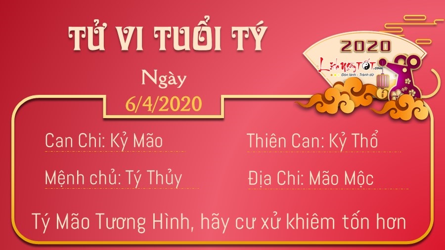 Tý Mão tương hình, tuổi Tý vốn rất thông minh và có thể hoàn thành tốt nhiệm vụ được giao, tuy nhiên đó không phải là lý do để bạn hay tỏ ra coi thường bạn bè và đồng nghiệp xung quanh, cho rằng người ta chỉ mang lại nhiều rắc rối cho mình. Trong ngày hôm nay, con giáp này nói năng không suy nghĩ nên cũng dễ đắc tội người khác. Hãy chú ý hơn trong giao tiếp, khi muốn góp ý với ai, đừng sử dụng những từ ngữ quá nặng nề, gây tổn thương cho người khác. Nhờ có Thiên Tài phù trợ nên bản mệnh làm ăn khá tốt, có thể kiếm được một khoản lợi kha khá nhờ các công việc làm thêm. Bạn nên có những kế hoạch đầu tư xa xôi hơn để giúp tài chính của mình thêm ổn định và vững mạnh.