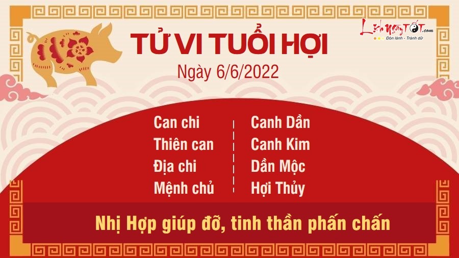 Nhị Hợp giúp người tuổi Hợi có tâm trạng phấn chấn khi bắt đầu một tuần mới. Bạn sẵn sàng thực hiện các công việc được phân công, cho dù đó là công việc mới mà bạn chưa xử lý bao giờ đi nữa. Tinh thần tích cực của bạn có thể truyền cảm hứng cho mọi người xung quanh, khiến cả tập thể hăng say làm việc. Hãy gắn kết mọi người với nhau, bạn sẽ nhận thấy mọi việc còn tiến triển thuận lợi hơn dự tính rất nhiều nữa. Trong ngày này, vị trí của Thai thần ở hướng chính Bắc phía ngoài phòng giã gạo, nơi xay bột và nhà bếp. Do đó, thai phụ không nên lui tới tiếp xúc nhiều, dịch chuyển vị trí đồ đạc, tiến hành các công việc sửa chữa đục đẽo ở nơi này. Bởi việc làm đó có thể làm động Thai thần, ảnh hưởng đến cả người mẹ và thai nhi.