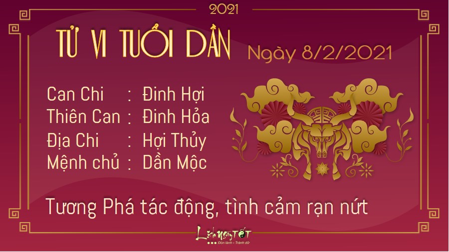 Cục diện Tương Phá mang đến những tác động không mong muốn với người tuổi Dần, mà chủ yếu là trên phương diện tình cảm. Những người đã kết hôn cần phải quan tâm và tâm sự với nửa kia nhiều hơn, đừng để cuối năm còn xảy ra sự cố đáng tiếc. Những người còn độc thân cũng không gặp được đào hoa tốt. Bạn khó tìm được người phù hợp và thật lòng quan tâm đến mình. Dường như chưa có ai khiến bạn thực sự rung động và bạn phải chờ thêm một khoảng thời gian nữa. Trên phương diện sự nghiệp, Chính Ấn cho thấy những nỗ lực của bạn trong suốt một năm qua đã được đền đáp xứng đáng. Bạn được cấp trên đánh giá cao và có nhiều cơ hội thăng tiến trong năm tới.