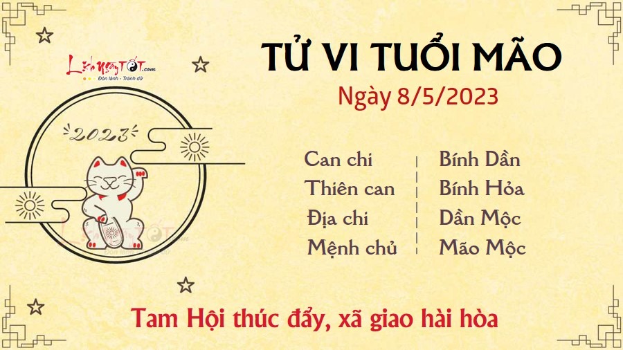 Nhờ Tam Hội thúc đẩy, người tuổi Mão tạo dựng được những mối quan hệ xã giao hài hòa trong ngày này. Với tính cách cởi mở và hòa nhã, đi đến đâu bạn cũng được mọi người yêu mến, công việc khó khăn đến mấy cũng được giúp đỡ để vượt qua. Hôm nay cũng là thời điểm thích hợp để người làm ăn kinh doanh hợp tác, đầu tư với khách hàng và đối tác. Nếu đôi bên có cùng một mục tiêu thì hãy nhanh chóng kí kết hợp đồng, bắt tay vào công việc càng sớm thì càng thu lời lãi sớm. Phương diện tình cảm của bản mệnh cũng khá êm ả. Người có đôi có cặp luôn nhận được sự quan tâm và chăm sóc của nửa kia. Dù hai bên bận rộn đến mấy thì cũng sắp xếp thời gian để gần gũi bên nhau.