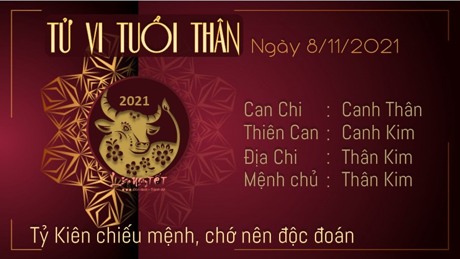 Tỷ Kiên giáng họa, người tuổi Thân có tính cách mạnh mẽ, quyết đoán, chính vì vậy mà bạn thích tự làm mọi việc theo ý mình, không muốn nhận sự giúp đỡ của người khác. Tuy nhiên, trước khi bắt tay vào làm việc gì, bạn phải đánh giá cho đúng tình hình thực tế và khả năng của chính bản thân mình, đừng mù quáng làm việc theo cảm xúc. Nếu bạn hướng tới đích đến không chính xác thì đến một lúc nào đó, bạn sẽ nhận ra là mình đã công cốc. Kim khí vượng, bản mệnh cần quan tâm hơn đến sức khỏe, đặc biệt là các bệnh liên quan đến xương cốt. Nếu là người làm trong lĩnh vực bàn giấy, bạn không nên ngồi một chỗ quá lâu, đồng thời nên sắp xếp thời gian để rèn luyện thể dục thể thao.