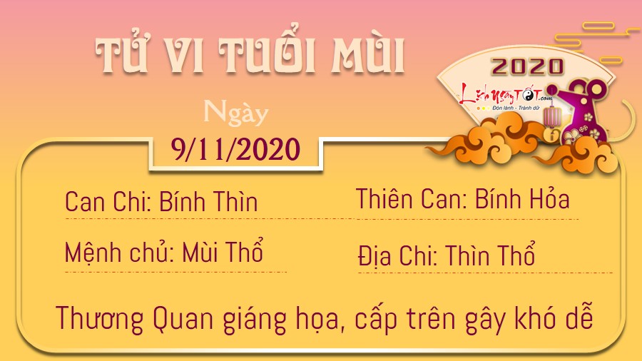 Thương Quan đem đến nhiều rắc rối cho người tuổi Mùi. Bản mệnh có thể bị cấp trên gây khó dễ, khiến tinh thần luôn căng thẳng, bức bối, khó có thể tập trung hoàn thành tốt nhiệm vụ của mình. Có thể một hành động nào đó của bạn đã gây ác cảm cho lãnh đạo. Nếu vẫn muốn tiếp tục công việc của mình, bạn cần ý thức được điều mình cần sửa đổi để hòa hoãn mối quan hệ giữa đôi bên. Nếu có ý định xuất hành vào ngày hôm nay, bạn nên đi về hướng Tây Nam để gặp Hỷ Thần hoặc hướng Đông để gặp Tài Thần. Như vậy, bạn sẽ gặp nhiều may mắn hơn trong công việc, tránh được những rắc rối không đáng có.