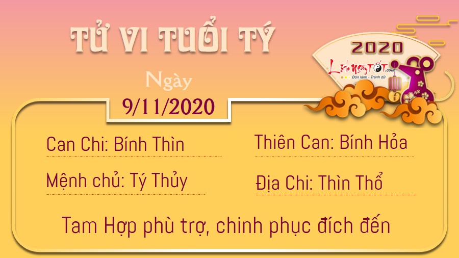 Người tuổi Tý có một ngày thuận lợi do được Tam Hợp phù trợ. Bản mệnh sẽ đạt được nhiều mục tiêu đã đặt ra, cốt là bạn giữ vững quyết tâm, không chùn bước trước khó khăn mà thôi. Hôm nay cũng là ngày thích hợp để người làm kinh tế đưa ra những quyết định đầu tư kinh doanh. Hơn thế, bản mệnh còn có cơ hội tiếp xúc và mở rộng quan hệ với một vài đối tác đáng tin cậy, mang lại nhiều lợi ích kinh tế cho tương lai. Tuy nhiên Thổ khắc Thủy cho thấy tình cảm gia đình bạn đang có dấu hiệu rạn nứt, cần quan tâm và chú ý hơn Nếu giữa vợ chồng xảy ra xích mích thì hai người nên trò chuyện thẳng thắn với nhau chứ không nên cứng đầu, không ai chịu nhường ai.