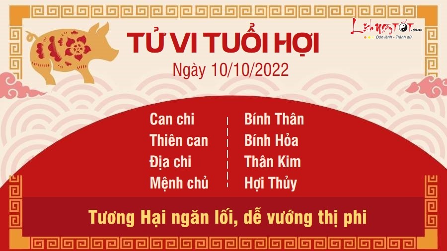 Tương Hại ngăn lối, người tuổi Hợi dễ vướng phải thị phi, mâu thuẫn trong ngày hôm nay, dù bạn đã cố gắng hết sức để tập trung vào nhiệm vụ của mình. Có vẻ như kẻ tiểu nhân sẽ luôn tìm ra cách để gây rắc rối cho bạn. Người làm ăn kinh doanh có thể sẽ phải nhận sự cạnh tranh kịch liệt tới từ đối thủ. Bản mệnh cần giữ vững lập trường và nắm rõ lợi thế cạnh tranh của bản thân, như vậy mới không sợ đối phương chơi xấu, rơi vào cảnh hao tài tốn của. Kim sinh Thủy, người độc thân có thể nhận được lời bày tỏ đến từ người khác giới. Dù bất ngờ nhưng nếu có thiện cảm với đối phương thì bạn có thể tạo điều kiện để đôi bên tìm hiểu thêm về nhau. Có thể đó là người bạn đã chờ đợi suốt bấy lâu đấy.