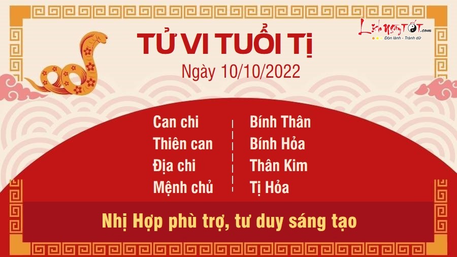 Do có Nhị Hợp phù trợ, người tuổi Tị đưa ra được nhiều ý kiến sáng tạo trong công việc, giúp những việc vốn đã quen thuộc trở nên thú vị và đem lại nhiều lợi ích hơn cho cả tập thể. Những đóng góp của bạn chắc chắn sẽ được cấp trên nhìn nhận và đánh giá đúng. Vì thế, hãy không ngừng cống hiến, đặc biệt là khi bạn vẫn còn trẻ tuổi. Bạn không ngại vất vả thì sẽ thăng tiến nhanh chóng hơn hẳn nếu so với mọi người. Hỏa khắc Kim, tiếc rằng con giáp này đang quá tập trung cho sự nghiệp nên chưa quan tâm quá nhiều đến chuyện yêu đương. Bạn muốn gây dựng một sự nghiệp vững vàng trước khi dành tình cảm cho một ai đó.