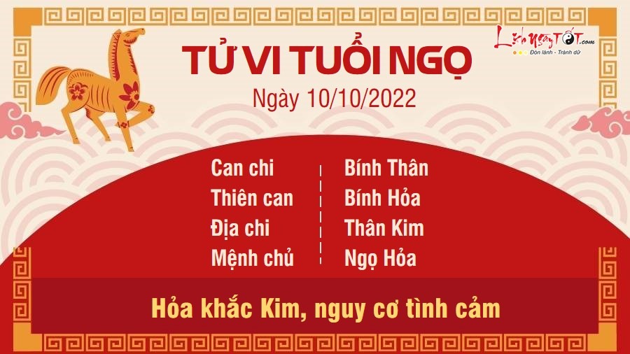 Hỏa khắc Kim, người tuổi Ngọ cần cẩn trọng trước những nguy cơ tình cảm đang rình rập. Bạn nên quan tâm hơn đến nửa kia, chớ nên lạnh lùng, thờ ơ kẻo kẻ thứ ba nhân cơ hội chen chân phá hoại hạnh phúc. Với những bạn còn độc thân, đào hoa xấu xuất hiện là dấu hiệu bạn cần phải cẩn trọng trước khi đi đến quyết định sẽ tới với một người nào đó. Hãy kết hợp cả lý trí chứ đừng chỉ dựa vào tình cảm nhất thời để đưa ra sự lựa chọn. Kiếp Tài gây rối, quan hệ giữa bản mệnh và đồng nghiệp cũng không mấy tốt đẹp. Bạn thường thích làm việc theo ý mình mà không chịu tuân theo quyết định của tập thể, chính vì thế mà công việc tiến triển khó khăn, thậm chí gây rắc rối cho người khác.