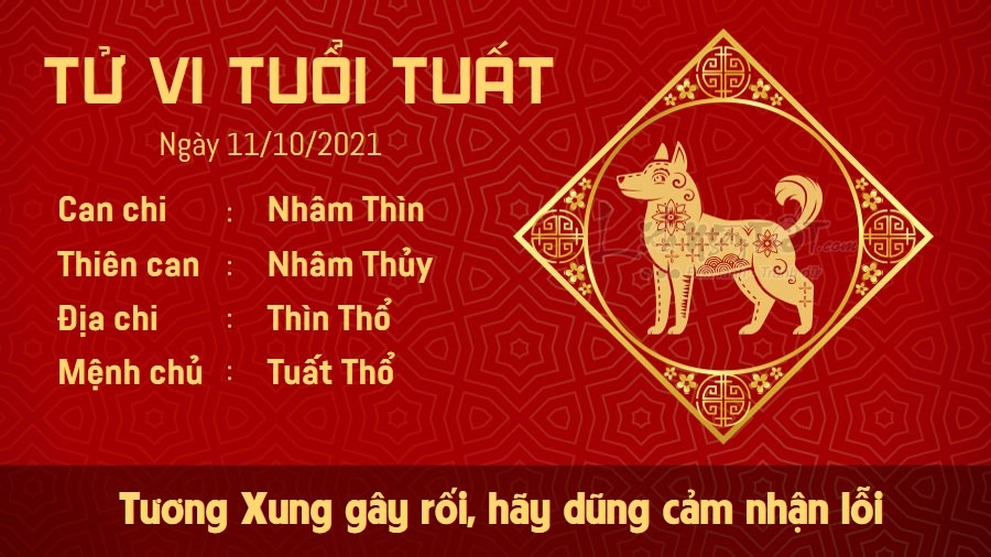Cục diện Tương Xung đẩy người tuổi Tuất vướng vào hết rắc rối này đến rắc rối khác. Hãy dũng cảm đứng ra nhận trách nhiệm trong những việc mình làm sai, nếu bạn còn muốn tiến bộ. Người khác cũng sẵn sàng tha lỗi cho bạn nếu bạn thành khẩn thôi. Trên phương diện tài lộc, những người làm ăn kinh doanh cần cẩn trọng khi đưa ra bất cứ quyết định hợp tác nào, nếu không bạn sẽ rất dễ mắc sai lầm hoặc rơi vào bẫy kẻ xấu giăng sẵn. Tốt nhất trong ngày hôm nay, bạn hãy giữ chặt tiền trong túi. Trong ngày Thổ vượng, bản mệnh cần phải chú ý nhiều hơn đến sức khỏe, tránh làm việc quá sức, dù bạn vẫn còn trẻ tuổi đi chăng nữa. Nếu cơ thể có dấu hiệu cảnh báo, hãy đi khám chữa ngay.