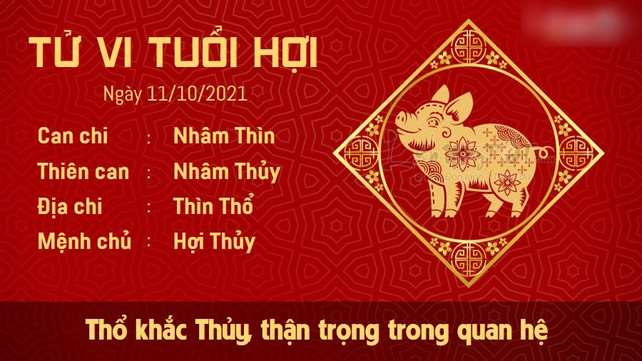 Thổ khắc Thủy, người tuổi Hợi còn độc thân chớ nên tin theo lời đường mật của người chưa thực sự thân quen. Rơi vào một mối tình quá nhanh chóng có thể khiến bạn phải chịu tổn thương trong tương lai. Người đã có gia đình muốn xây dựng mái ấm hạnh phúc thì cần học cách hạ cái tôi của mình xuống và thông cảm, bao dung với nửa kia nhiều hơn. Bạn không nên đặt ra những yêu cầu quá nghiêm khắc cho người ấy. Hôm nay là một ngày không mấy thuận lợi với người tuổi Hợi trên phương diện sự nghiệp. Do phải chịu tác động xấu của Tỷ Kiên, bản mệnh dễ vướng phải tranh chấp với đồng nghiệp. Tốt nhất bạn không nên nóng nảy, hành xử bốc đồng hoặc nói năng lỡ lời.
