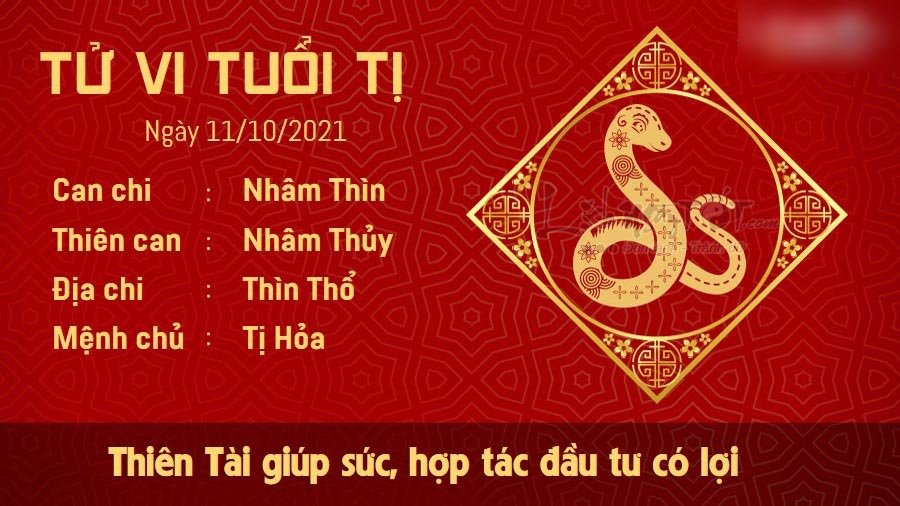 Thiên Tài giúp sức, người tuổi Tị có cơ hội phát tài phát lộc ngay trong ngày hôm nay. Người làm đầu tư, kinh doanh có thể nắm bắt được những cơ hội béo bở, nhờ vậy mà bản mệnh có thể nhận được những khoản lợi nhuận khả quan. Bản mệnh cũng có thể phát tài dựa vào sự may mắn của mình hoặc nhờ vào tiền người đi trước để lại. Tuy nhiên, bạn chớ vội nghĩ đến việc ăn chơi hưởng thụ. Muốn được sống dư dả, bạn cần có cách sử dụng khoản tiền đó hợp lý. Hỏa sinh Thổ, bản mệnh có một ngôi nhà khá yên bình. Mỗi khi về đến nhà, bạn đều cảm thấy vô cùng thư thái. Vì vậy, nếu có vấn đề gì còn khúc mắc, bạn đừng ngại tâm sự với những người thân thiết nhất.