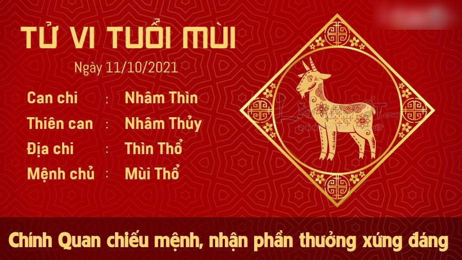 Chính Quan chiếu mệnh, người tuổi Mùi sẽ nhận được phần thưởng xứng đáng với những gì đã bỏ ra. Cấp trên luôn hài lòng và yên tâm mỗi khi giao trách nhiệm cho bạn, bởi bạn là người có trách nhiệm cao, làm việc có đầu có đuôi, chẳng bao giờ bỏ dở giữa chừng. Bạn có thể được cất nhắc vào một vị trí xứng đáng hơn với năng lực của mình. Đây chính là lúc bạn cần dũng cảm nhận trách nhiệm và tin tưởng hơn nữa vào chính mình. Bạn hoàn toàn có thể gặt hái được những thành công còn lớn lao hơn hiện tại. Nếu có ý định xuất hành vào ngày hôm nay, bạn nên đi về hướng Nam để gặp Hỷ Thần hoặc hướng Tây để gặp Tài Thần.