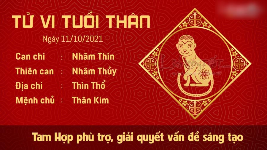 Tam Hợp phù trợ, tuổi Thân hoàn thành xuất sắc mọi nhiệm vụ được giao trong ngày hôm nay. Bạn có cái nhìn mới về nhiều vấn đề, nhờ đó mà bạn có thể tìm ra nhiều cách giải quyết mới lạ, khiến mọi người ngạc nhiên. Những ai cần tham gia thi cử sẽ gặp nhiều điều thuận lợi trong ngày hôm nay, tuy nhiên, nếu muốn đạt được điểm số cao, bạn vẫn không được phép chủ quan, lơ là. Hãy ôn luyện thật kĩ trước khi bước vào phòng thi nhé. Thổ sinh Kim cho thấy mối quan hệ giữa bản mệnh và người khác giới vô cùng tốt đẹp. Nếu còn độc thân, bạn nên thử cho người thật lòng với mình một cơ hội để xích lại gần hơn xem sao. Có thể quen biết đối phương lâu, bạn sẽ nhận ra nhiều ưu điểm của người đó.