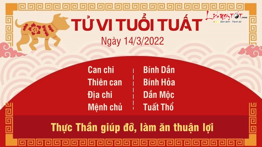 Thực Thần giúp cho người tuổi Tuất chẳng còn phải lo lắng đến vấn đề tiền bạc. Các mối quan hệ rộng rãi giúp bạn nhanh chóng được tiếp xúc với những đối tác và kế hoạch làm ăn triển vọng. Tuy nhiên, dù có rủng rỉnh đến thế nào đi nữa, bản mệnh cũng chớ nên khoe khoang kẻo sập bẫy kẻ tiểu nhân lúc nào không hay. Tốt nhất, hãy luôn khiêm tốn, lắng nghe mọi người xung quanh để ngày một tài giỏi và giàu kinh nghiệm hơn. Hôm nay trực Bế là ngày xấu mọi việc trừ đắp đê, lấp hố, rãnh. Vì thế, nếu có kế hoạch thực hiện những việc đã nêu trên, bạn nên lùi sang thời điểm khác thích hợp hơn để tránh những tác động xấu.