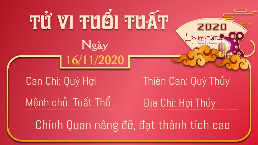 Chính Quan đem lại nhiều tin vui cho người tuổi Tuất, nhất là với những ai đang đi theo con đường học tập, nghiên cứu. Có thể những quan điểm đúng đắn của bạn đang dần được mọi người ghi nhận và đánh giá cao. Vì thế, dù có trẻ tuổi, bạn cũng đừng ngại nêu ý kiến của mình để mọi người cùng thảo luận. Sự tự tin sẽ giúp bạn thăng tiến nhanh hơn nhiều. Đừng mãi chỉ giữ những quan điểm ở trong lòng mình. Thổ khắc Thủy khuyên con giáp này cần phải quan tâm nhiều hơn nữa tới con cái của mình. Đừng để đến khi mối quan hệ của mình và các con đang dần trở nên xa cách mới cảm thấy hối hận. Hãy bớt thời gian cho công việc và dành nhiều thời gian hơn người thân của mình.