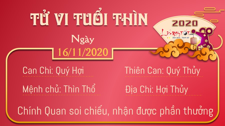 Chính Quan cho thấy người tuổi Thìn sẽ nhận được phần thưởng xứng đáng cho những gì đã bỏ ra. Tinh thần làm việc nghiêm túc, có trách nhiệm cao của bạn khiến lãnh đạo tin tưởng và đồng nghiệp yêu mến. Tuy nhiên, khi tiếp thu các nội dung công việc mới, bạn cần cởi mở và suy nghĩ thoáng hơn. Đừng mãi đi theo những lối mòn vạch sẵn. Nếu dám mở lối đi riêng, bạn sẽ gặt hái được nhiều thành quả xuất sắc hơn nhiều. Thổ khắc Thủy cũng khuyên con giáp này cần phải bình tĩnh hơn khi nói chuyện với nửa kia cho dù đôi bên có đang bất đồng ý kiến. Bản mệnh đừng khăng khăng với ý kiến cá nhân, hãy dành thời gian để lắng nghe những điều người ấy nói.