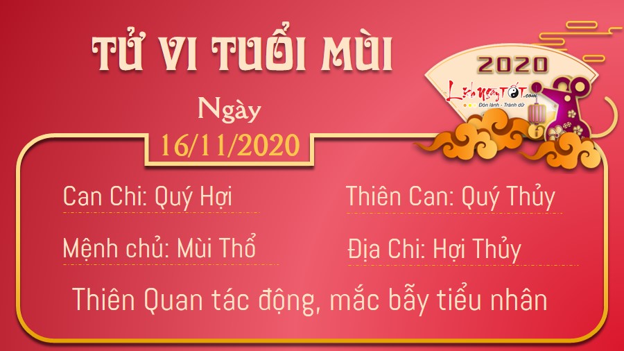 Tuổi Mùi phải giữ đầu óc hết sức tỉnh táo trong ngày phải chịu tác động xấu của Thiên Quan như hôm nay, bởi chỉ cần lơ là, thiếu tập trung một chút thôi là bạn rơi vào bẫy của kẻ tiểu nhân ngay. Song nếu có thể giữ vững quan điểm và chính kiến của mình thì bạn không cần phải sợ bất cứ ai, cho dù đó là người có chức quyền đi chăng nữa. Bạn hoàn toàn có đủ khả năng để vượt qua những trắc trở xuất hiện trước mắt. Hôm nay trực Kiến là ngày tốt cho xuất hành hoặc cưới hỏi. Vì vậy, bản mệnh nên sắp xếp kế hoạch cho phù hợp để quá trình thực hiện gặp nhiều may mắn.