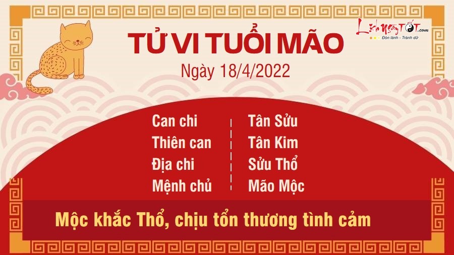 Mộc khắc Thổ cảnh báo những đổ vỡ, tổn thương có thể đến với người tuổi Mão trong ngày hôm nay. Bạn quá thờ ơ với gia đình mình nên quan hệ giữa các thành viên ngày càng trở nên lạnh nhạt. Thậm chí có người phải chịu cảnh phản bội của nửa kia. Nếu vẫn còn quý trọng gia đình mình và dành tình yêu thương cho nửa kia, bạn nên tìm cách cứu vãn trước khi mọi chuyện đã quá muộn. Đừng viện lý do công việc bận rộn để tiếp tục đắm mình trong thế giới riêng nữa. Thiên Tài lại đem tới tin vui trên phương diện tài lộc cho con giáp này. Những người luôn chăm chỉ với các công việc làm thêm có thể nhận được khoản tiền lương tương xứng. Mức sống của gia đình bạn đang dần được cải thiện.