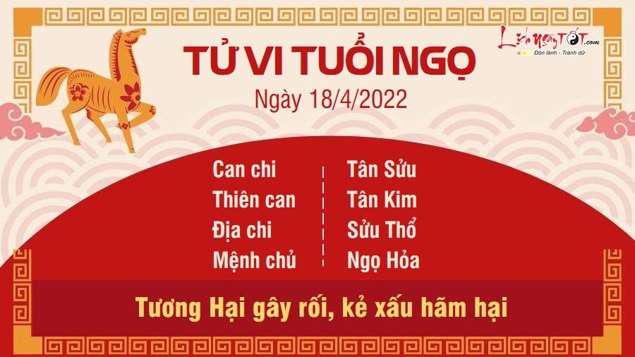Tương Hại gây rối, người tuổi Ngọ dễ gặp phải rắc rối với kẻ tiểu nhân. Những kẻ xấu bụng có thể nhân lúc bạn sơ suất để tìm cách hãm hại bạn, khiến công lao của bạn đổ sông đổ bể. Do đó, con giáp này cần phải nhắc nhở bản thân mình cẩn thận và có cái nhìn đa chiều hơn về mọi việc. Đặc biệt, bạn chớ nên kiêu ngạo, làm mọi việc theo ý mình. Hãy luôn nghe lời khuyên của những người giàu kinh nghiệm và thực sự muốn tốt cho mình. Ngược lại, Hỏa sinh Thổ cho thấy vợ chồng bạn sẽ có 1 ngày ngọt ngào với những kỷ niệm được hâm nóng lại. Đôi bên cùng trân trọng khoảng thời gian đã qua và mong muốn có thể tạo ra thêm nhiều kỷ niệm hơn nữa trong tương lai.