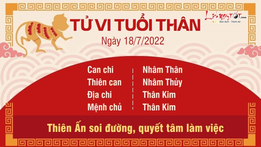 Thiên Ấn soi đường, người tuổi Thân xác định được mục tiêu tiếp theo cho mình. Bản mệnh không còn lơ là nữa mà tràn đầy quyết tâm cũng như tự tin để khẳng định giá trị bản thân. Với người trẻ tuổi mới bước chân vào lĩnh vực mới, bạn nhận được sự chỉ dẫn của những người giàu kinh nghiệm hơn. Hãy luôn khiêm tốn lắng nghe, bạn sẽ biết thêm được nhiều kiến thức hữu ích, phục vụ cho công việc tương lai. Nếu có ý định xuất hành trong ngày hôm nay, bạn nên chọn đúng những hướng tốt để công việc thêm phần thuận lợi. Hướng tốt bao gồm hướng Nam sẽ giúp bạn gặp Hỷ Thần và hướng Tây sẽ giúp bạn gặp được Tài Thần.