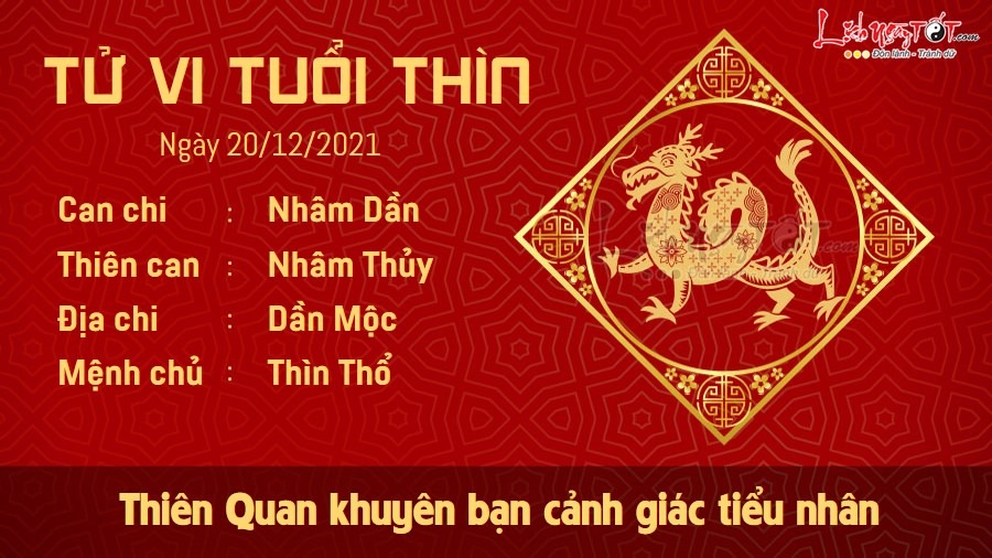 Thiên Quan đem tới nhiều điều hung họa cho vận trình sự nghiệp của người tuổi Thìn. Hôm nay bạn cần hết sức chú ý những kẻ cố tình tiếp cận mình, đó có thể là kẻ tiểu nhân đang tìm cách hãm hại bạn. Người làm lãnh đạo chớ nên tin theo lời xu nịnh của những kẻ nịnh hót mà đưa ra những quyết định sai lầm. Trước khi làm việc gì, bản mệnh cần lắng nghe đa chiều và suy xét vấn đề kĩ càng hơn, như vậy mới không ảnh hưởng đến thành tích của tập thể. Mộc khắc Thổ cũng cho thấy nhiều vấn đề trong chuyện tình cảm của con giáp này. Dường như bạn không thể duy trì được sự yên bình trong quan hệ vợ chồng được lâu. Hai người dễ mâu thuẫn, tranh cãi với nhau chỉ vì những chuyện rất nhỏ nhặt.