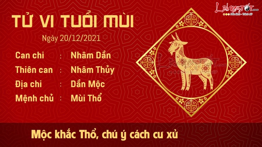 Mộc khắc Thổ, các mối quan hệ xã giao của người tuổi Mùi dễ vướng phải trục trặc. Bạn cần chú ý đến cách cư xử với mọi người, đừng vô tình đắc tội với bạn bè, đồng nghiệp xung quanh. Dù có gì bất mãn, bản mệnh cũng hãy bình tĩnh trao đổi. Chuyện tình yêu cũng không tiến triển suôn sẻ được như ý muốn. Bạn chớ nên cho mình cái quyền ép buộc nửa kia làm chuyện này, chuyện khác. Hãy chú ý đến suy nghĩ và cảm nhận của người ấy hơn để tránh những mâu thuẫn không đáng có. Ngày 20/12/2021 là ngày Ngày Sát chủ. Theo quan niệm dân gian, ngày này thuộc Bách kỵ, trăm sự đều kỵ, không nên làm các việc trọng đại, bất kể đối với tuổi nào. Nếu có thể, bạn nên lùi sang thời điểm khác thích hợp hơn.