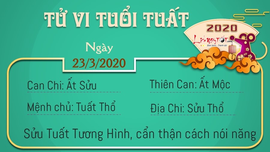 Sửu Tuất tương hình, người tuổi Tuất dù là con giáp tốt bụng nhưng lại quá thẳng thắn trong cách nói năng. Bạn dễ gây ra những phản ứng trái chiều với người nghe, dù mục đích của bạn có là tốt đi chăng nữa. Hãy chú ý hơn đến cách diễn đạt của mình. Trong công việc, bạn cũng cần cố gắng nếu gặp phải khó khăn chứ không nên đầu hàng ngay lập tức. Nếu nhận thấy vấn đề vượt quá khả năng giải quyết của mình, bạn cũng đừng ngại xin sự trợ giúp từ đồng nghiệp hoặc những người có kinh nghiệm xung quanh. Nếu định xuất hành trong ngày, bạn nên đi về hướng Tây Bắc để gặp Hỷ Thần hoặc Đông Nam để gặp Tài Thần, bản mệnh có thể gặp được quý nhân nếu chọn được hướng đi thích hợp.