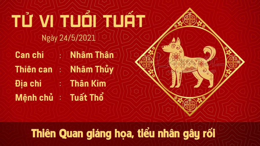 Thiên Quan giáng họa cho thấy người tuổi Tuất phải đối mặt với rất nhiều chuyện khó giải quyết. Kẻ tiểu nhân ngầm gây rối khiến cho công việc của bạn không thể tiến triển suôn sẻ được như ý muốn. Bạn cần giữ vững suy nghĩ và quan điểm của mình, không nên lung lay vì những lời bàn ra tán vào của người khác. Chỉ có bạn mới biết rõ như thế nào mới là tốt nhất cho bản thân mình. May mắn, trên phương diện tình cảm, Thổ sinh Kim, người tuổi này rất vượng đào hoa. Nếu đã có đối tượng thầm mến và còn độc thân, bạn nên cho đôi bên một cơ hội tìm hiểu về nhau kĩ hơn. Đã đến lúc bạn cần tìm một người cùng chia sẻ niềm vui nỗi buồn rồi đấy.