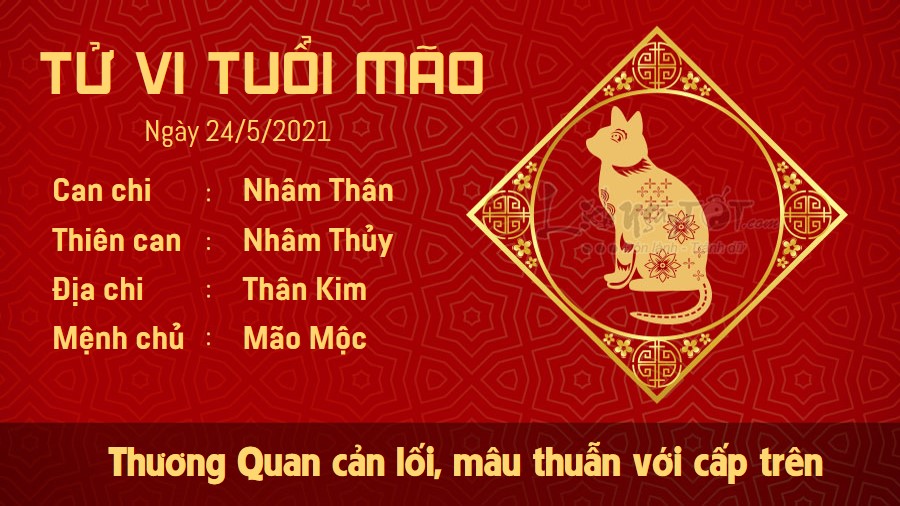 Thương Quan cản lối, người tuổi Mão khó có đường con đường thăng quan tiến chức thuận lợi trong ngày hôm nay. Bạn dễ vướng phải mâu thuẫn với người làm lãnh đạo, thậm chí khiến quan hệ đôi bên sứt mẻ. Hãy cẩn thận hơn trong cách cư xử, nhất là khi đối tượng giao tiếp lại là cấp trên của bạn. Dù có muốn bảo vệ ý kiến của mình, bạn cũng không nên có thái độ quá nóng nảy, tiêu cực, thậm chí bỏ ngoài tai góp ý của người ngoài. Kim khắc Mộc, mối quan hệ giữa con giáp này và người nhà không quá yên bình. Dù bận rộn đến mấy, có lẽ đôi bên vẫn cần dành nhiều thời gian để trò chuyện với nhau hơn, đừng để mối quan hệ giữa mọi người ngày càng xa cách.