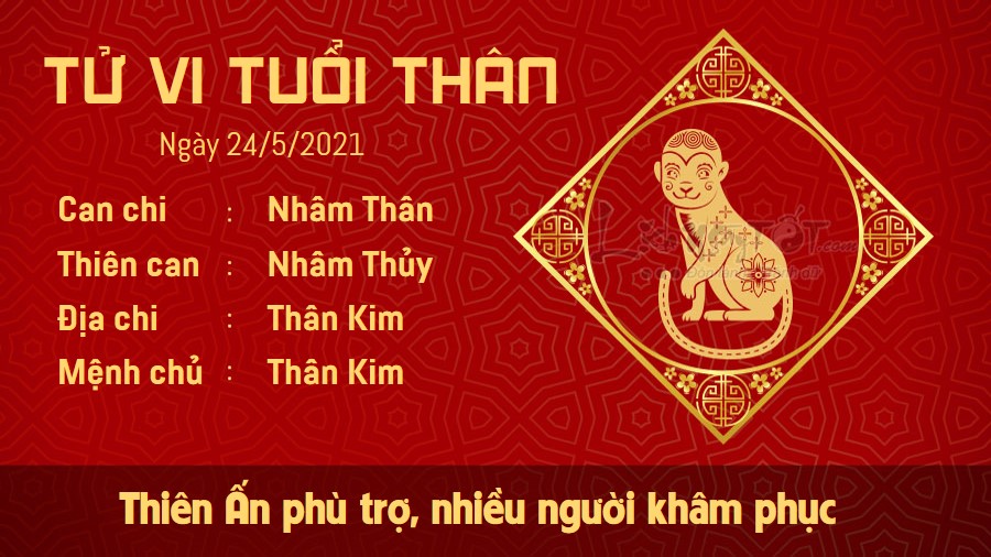 Thiên Ấn tạo cơ hội cho những người tuổi Thân làm việc trong các lĩnh vực dịch vụ, nghệ thuật, nghiên cứu... cơ hội khẳng định bản thân. Bạn nhận được sự khâm phục của mọi người. Trong ngày hôm nay, dù có phải đối diện với khó khăn, bạn cũng vẫn giữ được bình tĩnh và dần đưa ra được cách giải quyết công việc sáng suốt. Bạn có thể trở thành tâm gương sáng cho bạn bè, đồng nghiệp. Tuy nhiên, Kim khí vượng, bản mệnh cần quan tâm hơn đến sức khỏe, đặc biệt là các bệnh liên quan đến xương cốt. Người lớn tuổi chú ý không làm việc quá sức, người còn trẻ cũng không nên làm việc quá sức, bỏ qua cảnh báo của cơ thể.