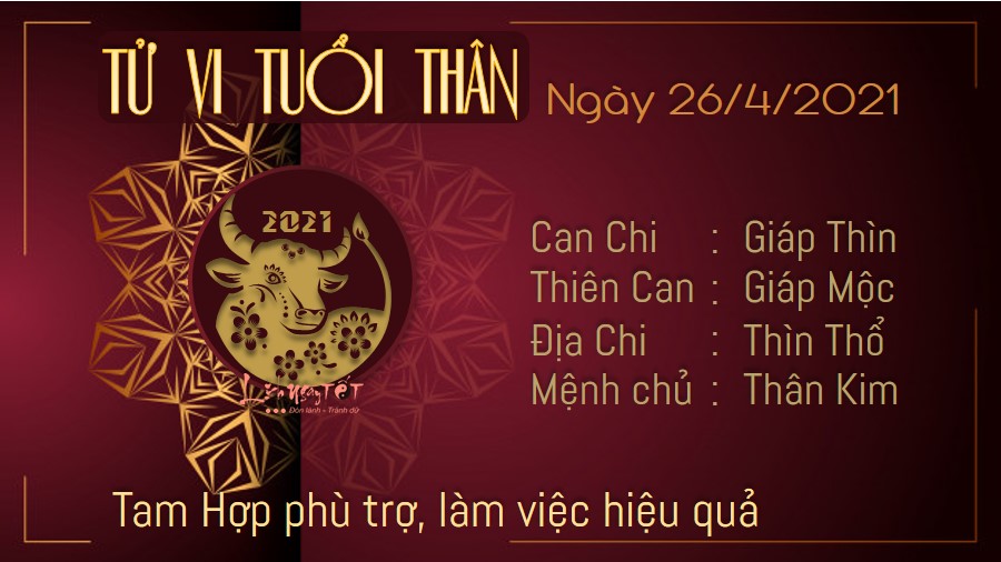 Tam Hợp phù trợ, người tuổi Thân làm việc gì cũng vô cùng hiệu quả. Bạn có cơ hội lọt vào mắt xanh của người làm lãnh đạo nếu biết phát huy điểm mạnh của mình, sẵn sàng đứng ra nhận những nhiệm vụ khó khăn khi mọi người đều có ý thoái thác. Những ai cần tham gia thi cử sẽ gặp nhiều yếu tố thuận lợi trong ngày hôm nay, tuy nhiên, bạn vẫn không được chủ quan, lơ là. Nếu muốn đạt được điểm số cao, bạn cần ôn luyện kĩ càng và làm bài cẩn thận. Thổ sinh Kim cho thấy mối quan hệ giữa bản mệnh và người khác giới vô cùng tốt đẹp. Nếu còn độc thân và đang có người tìm hiểu, bạn nên thử cho đôi bên một cơ hội xem sao. Đừng rút lui ngay khi tình yêu vừa gõ cửa.
