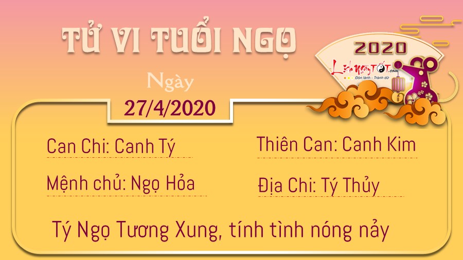 Tý Ngọ tương xung, người tuổi Ngọ trở nên rất nóng nảy. Bạn khó có thể giữ bình tĩnh và không biết cách tiết chế cảm xúc nên thường hay có những hành động gây tổn thương hoặc ác cảm với mọi người xung quanh. Trong các mối quan hệ xã hội, nếu còn độc thân bản mệnh có thể nhận ra rằng có nhiều đối tượng khác giới quan tâm đến mình. Tuy vậy, dường như đa số đều có mục đích riêng khi tiếp xúc với bạn, vì vậy tốt nhất là bạn hãy chú ý giữ khoảng cách vừa phải. Hôm nay trực Thành là ngày thích hợp để xuất hành, khai trương, giá thú. Bạn có thể thực hiện những kế hoạch mình đặt ra từ trước đó nhưng không quên căn cứ vào tình hình thực tế ở khu vực mình sinh sống.
