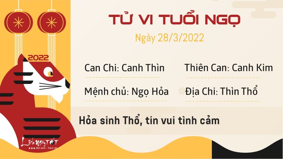 Hỏa sinh Thổ đem lại tin vui tình cảm cho người tuổi Ngọ, bất kể bạn đã lập gia đình hay vẫn còn độc thân. Để tận hưởng trọn vẹn hạnh phúc, bạn nên mở lòng đón nhận, không nên giữ những cảm xúc tiêu cực trong lòng. Hôm nay cũng là ngày thích hợp để các cặp đôi hâm nóng tình cảm của mình. Bạn và người ấy không cần phải làm điều gì lớn lao, chỉ cần một bữa tối cùng nhau chuẩn bị và cùng nhau nấu nướng đã có thể khiến cả hai cảm thấy rất vui vẻ và hạnh phúc rồi. Chính Quan nâng đỡ, con đường sự nghiệp của bản mệnh cũng có những bước thăng tiến rõ rệt. Những thành công bạn gặt hái được khiến cấp trên rất vừa lòng và sẵn sàng giao cho bạn những cơ hội tiếp theo nhằm giúp củng cố vị trí của bạn.