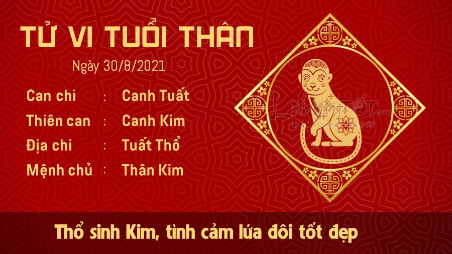 Thổ sinh Kim báo tin mừng cho chuyện tình cảm của tuổi Thân. Sau nhiều mâu thuẫn, tranh cãi thì cuối cùng hai người cũng giải quyết được ngọn nguồn vấn đề. Sau mỗi lần như thế này, bạn và người ấy lại càng thấu hiểu nhau hơn. Ngoài ra, con giáp này còn là một người cha, người mẹ rất quan tâm đến con cái của mình. Bạn thường xuyên trò chuyện để có thể trở thành một người bạn thân thiết và gần gũi của con. Tuy nhiên, Tỷ Kiên cho thấy bạn sẽ gặp phải một vài rắc rối trong sự nghiệp đấy. Khi mâu thuẫn với đồng nghiệp nổ ra, bạn cần hết sức bình tĩnh chứ chớ vội nóng nảy, khiến tình hình càng thêm căng thẳng, không giải quyết được việc gì.