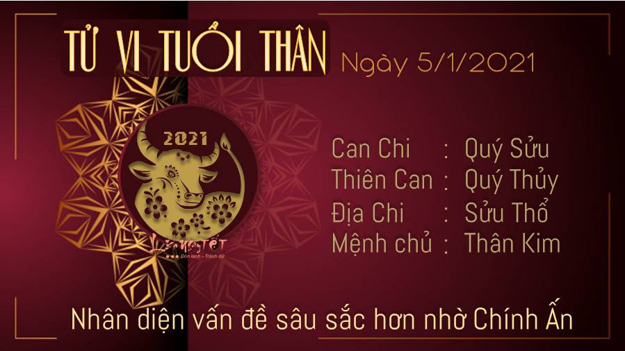 Có những vấn đề mà ngày hôm nay tuổi Thân sẽ thấy chúng trở nên sâu sắc hơn, rõ ràng hơn với sự nâng đỡ của Chính Ấn thay vì chỉ xem xét hời hợt ở phương diện bề nổi. Hãy cho mình thời gian để thẩm thấu và hiểu rõ mình cần phải đi hướng đi nào cho thích hợp nhé. Ngũ hành tương sinh là thời gian bản mệnh nên dành để cải thiện mối quan hệ của mình, nhất là tình cảm anh em, bạn bè sẽ càng thêm bền chặt nếu bạn thể hiện sự quan tâm chân thành tới họ. Hôm nay là ngày 5/1/2021, dân gian gọi là ngày Ngày Vãng vong. Ngày này không nên thực hiện những việc quan trọng vì dễ gặp bất trắc đấy nhé.
