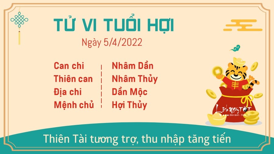Hôm nay là ngày tuổi Hợi gặp may mắn về tiền bạc nhờ có Thiên Tài tương trợ. Nguồn thu chủ yếu đến từ các hạng mục kiếm thêm chứ không phải thu nhập chính. Công việc kinh doanh hoặc các nghề tay trái đang đem lại cho con giáp này khoản thu nhập ổn định, giúp bạn trang trải cuộc sống dễ dàng hơn. Đường công danh sự nghiệp trong ngày cũng không có gì phải lo lắng. Kế hoạch diễn ra tuần tự và nhất quán, theo đúng những tính toán của con giáp này. Thông qua đó bạn có thể dễ dàng xây dựng được uy tín của mình trong tập thể. Chuyện tình cảm trong ngày ít biến động, thậm chí có nhiều cặp đôi còn rơi vào tình trạng xa cách, lạnh nhạt. Một buổi hẹn để hâm nóng tình cảm là điều cần thiết vào lúc này. Hãy lên kế hoạch tạo bất ngờ cho người ấy đi nhé.