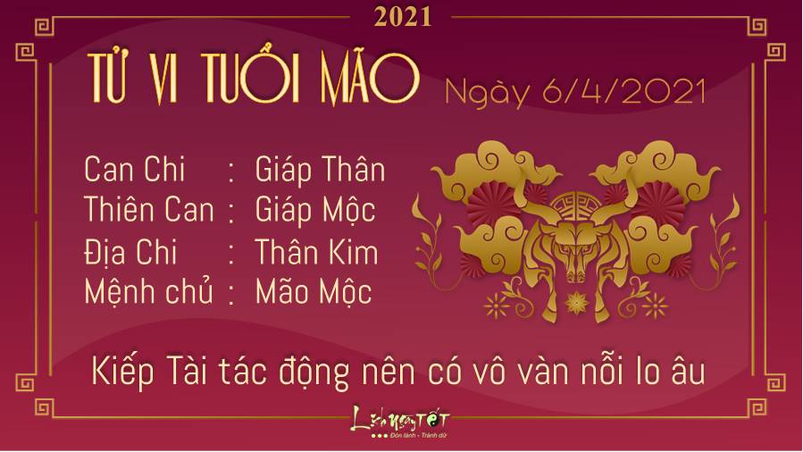 Kiếp Tài tác động nên hẳn nhiên trong lòng tuổi Mão lúc này là vô vàn những nỗi lo âu, trăn trở riêng, tuy nhiên đừng vì thế mà bực tức, cáu kỉnh với mọi người. Ai cũng yêu quý bạn, đừng để làm xấu đi ấn tượng tốt đẹp mà họ có về bạn và dành cho bạn những lời không hay nhé. Ngũ hành xung khắc nhắc nhở bản mệnh lúc này phải thận trọng trong chi tiêu nhé. Đừng chỉ bốc đồng trong chốc lát rồi hối hận vì những lựa chọn của bạn. Hãy nhớ rằng nếu bạn có kế hoạch chi tiêu tiền hợp lý, bạn có thể có được một khoản dự phòng trong những trường hợp cần thiết cho tương lai. Hôm nay 6/4/2021 dương lịch là ngày Can Giáp, không trị bệnh ở đầu. Vì thế, bản mệnh lưu ý trách tác động lên vị trí này bạn nhé.