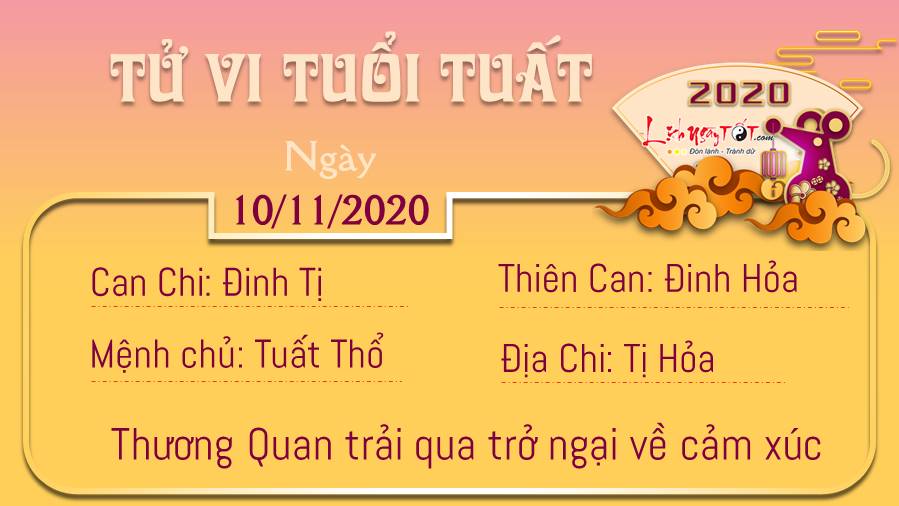 Thương Quan dự đoán, người tuổi Tuất phải trải qua một giai đoạn không dễ dàng về mặt cảm xúc, dường như bạn phải chật vật vật lộn với chính những ưu tư của mình. Trong khi bạn khát khao có được sự giúp đỡ thì dường như ai đó cũng đang bận rộn với vấn đề của họ và không thể nào hỗ trợ được bạn như bạn muốn đâu. Thổ - Hỏa tương sinh là cơ hội để người độc thân có thể bày tỏ tình cảm mà bạn chất chứa từ lâu với người bạn yêu mến. Thời gian này cũng rất tốt cho các cặp đôi lên kế hoạch cho chuyến đi chơi xa. Hôm nay là ngày 25 âm lịch nhân thần ở trong miệng, khắp thân mình và túc dương minh vị kinh. Tránh mọi sự tổn thương, va chạm, mổ xẻ, châm chích tại vị trí này bạn nhé.