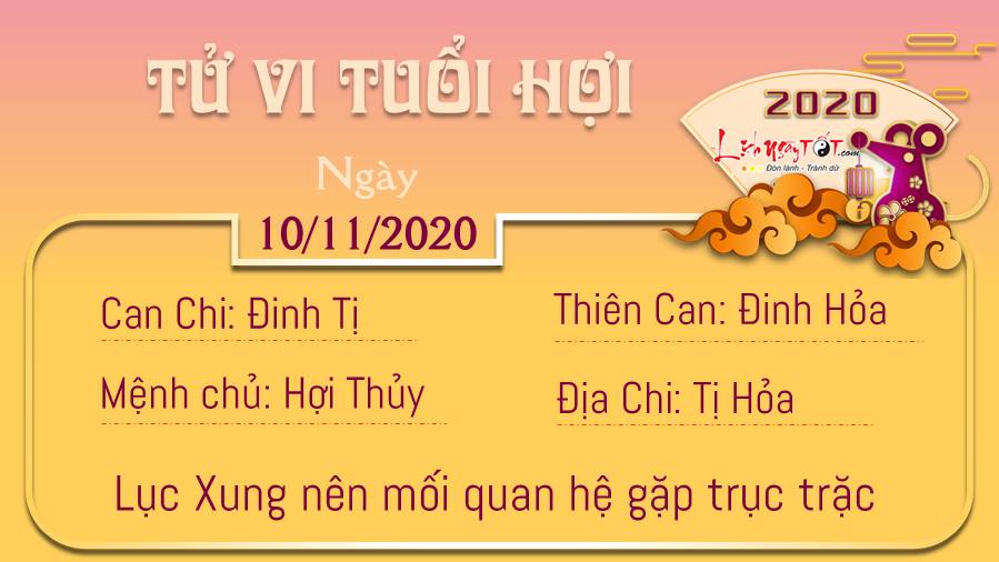 Ảnh hưởng Lục Xung nên đây là ngày mà mối quan hệ nào đó của người tuổi Hợi có thể gặp trục trặc, khiến cho bạn rơi vào một khoảng thời gian không dễ chịu chút nào, trong đó bao gồm cả sự bất an, lo lắng, không yên tâm. Tuy nhiên đừng căng thẳng quá, bởi vì mọi thứ sẽ sớm đi qua và nhường lại cho những cảm xúc tích cực hơn. Chính Quan khuyến khích người tuổi Hợi thẳng thắn đối diện và thử sức mình với điều gì đó mới mẻ. Khi bạn tự tin vào bản thân mình và áp dụng những kiến thức bạn có vào thực tế, bạn sẽ thấy những cánh cửa cơ hội mở ra với bạn đấy. Ngũ hành xung khắc cho thấy, bản mệnh băn khoăn khi mà mọi dự định của mình bị người ấy không đồng thuận.