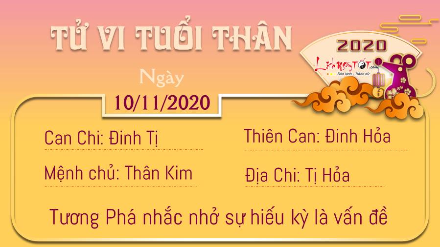 Ảnh hưởng của Kiếp Tài nên những vết thương trong quá khứ khiến bạn đau đớn và tuổi Tị không dám tin tưởng vào người khác. Có thể ai đó sẵn lòng hỗ trợ bạn, nhưng bạn lại quá đa nghi để có thể đón nhận sự nhiệt tình của họ. Lúc này, chính lòng bạn còn có quá nhiều câu hỏi đặt ra trong đầu và chưa đủ tự tin để có thể mở lòng với đối phương ngày hôm nay. Nhưng nếu có thể, cần khéo léo từ chối nhé, dù sao bạn cần chút thời gian yên tĩnh để có câu trả lời chính xác hơn. Hôm nay ngày 10/11/2020 dương lịch là ngày Can Đinh, không trị bệnh ở tim. Do đó, bản mệnh lưu ý tránh tác động lên vị trí này trong ngày hôm nay.