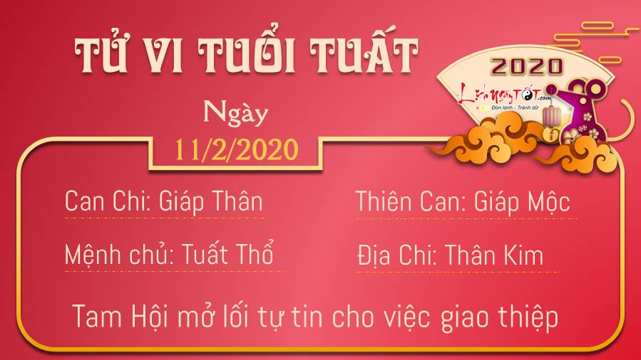 Tam Hội mở lối cho con giáp tuổi Tuất tự tin hơn trong việc giao thiệp, làm quen những người mới. Người tuổi Tuất cảm thấy tự tin và lạc quan hơn khi có tin vui liên quan tới tiền bạc trong ngày có Thiên Tài nâng đỡ. Tuy nhiên, bạn chớ mong có điều gì nhanh chóng xảy ra, có thể kết quả hiện tại nhờ công sức bao năm nay của bạn đấy, vì thế, đừng vội khoe khoang và tiết lộ điều gì vào lúc này sẽ có lợi hơn cho bạn. Ngũ hành tương sinh cho thấy vận trình tình cảm của bản mệnh lúc này khá ưng ý, người độc thân hứa hẹn tìm được người thú vị để chuyện trò mỗi ngày. Trong khi đó, các cặp đôi có thể nhận được tin vui bầu bí hoặc sinh nở trong ngày này.