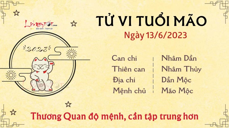Người tuổi Mão cần tập trung hơn vào công việc và các kế hoạch hiện tại trong ngày Thương Quan xuất hiện. Bạn dễ bị phân tâm vì những vấn đề xảy ra xung quanh cho dù nó vốn không hề liên quan đến bạn. Điều đó chỉ khiến bạn tốn thêm thời gian vào những việc vô bổ trong khi nhiệm vụ của mình vẫn còn dang dở. Đường tài lộc trong ngày cũng bị ảnh hưởng ít nhiều. Do thiếu kiên nhẫn nên Mão dễ để cơ hội vụt qua trước mắt, đáng lẽ sẽ thu được tiền bạc về tay thì cuối cùng lại rơi vào túi người khác, chỉ để lại sự tiếc nuối mà không thay đổi được gì. Hãy coi như đây là bài học để không bao giờ rơi vào hoàn cảnh tương tự nữa. Vì ngũ hành tương xung nên chuyện tình cảm của con giáp này cũng gặp phải những nỗi buồn khó diễn tả. Những rắc rối trong công việc và chuyện tiền bạc khiến tâm trạng của bạn khá sa sút, dẫn đến có những hành động và lời nói không phù hợp, khiến cho nửa kia bị tổn thương và xảy ra tranh cãi.