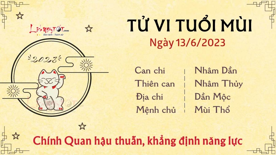 Người tuổi Mùi trong ngày được Chính Quan nâng đỡ nên có nhiều cơ hội khẳng định năng lực của mình trong công việc. Những thách thức và khó khăn trước mắt không khiến bạn nao núng, sợ hãi hay lùi bước bởi bạn cho rằng đó chính là cơ hội để mình rèn luyện bản thân và tích lũy thêm kinh nghiệm. Vận tài chính của tuổi này khá tốt đẹp, nhờ thế mà tinh thần được thoải mái, thảnh thơi phần nào, không phải lo nghĩ quá nhiều về vấn đề tiền bạc. Nguồn thu nhập duy trì ở mức ổn định, con giáp này nên tập trung làm tốt công việc chính của mình để đảm bảo ngân sách luôn được duy trì như hiện tại. Tuy nhiên, vận trình tình cảm lại có rắc rối khi tuổi Mùi gặp phải cục diện ngũ hành xung khắc. Giữa bạn và nửa kia có nhiều quan điểm trái ngược, hai người lại không cố gắng tìm cách hòa hợp mà thường để xảy ra tranh cãi nhằm bảo vệ quan điểm của mình đến cùng, không ai chịu nhường ai.