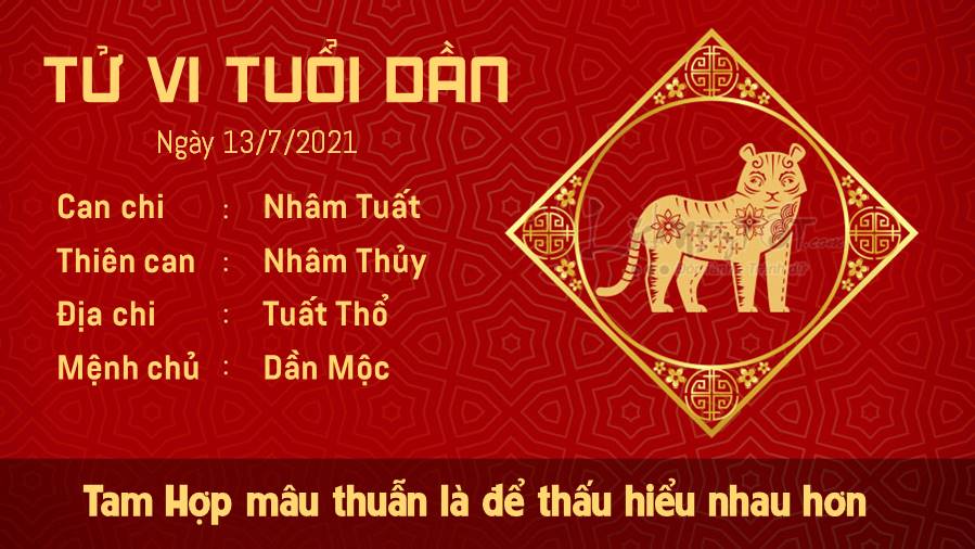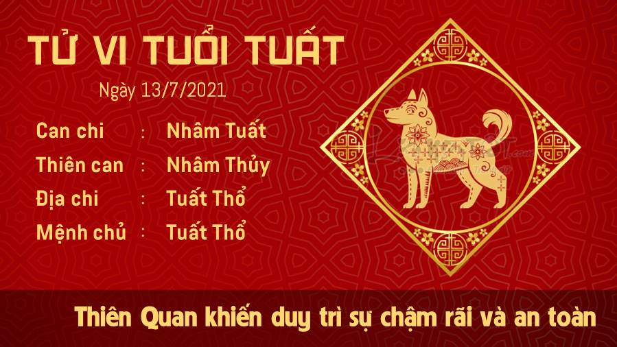 Thiên Quan khiến con giáp tuổi Tuất muốn duy trì sự chậm rãi và an toàn, nhưng sự thật là bạn cần phải nỗ lực nhiều hơn để thoát khỏi vòng an toàn thì mọi chuyện mới được như mong muốn. Có thể bạn sẽ không thành công ngay lập tức nhưng hãy kiên nhẫn và thực hiện từng bước cho đến khi bạn thấy được sự thay đổi. Một ngày mà sự nghiệp của trên đà phát triển. Hãy cho mình cơ hội được thả lỏng, thư giãn một lúc thay vì cứ chạy theo những mục tiêu cao vời và rồi mệt mỏi nhé. Chậm lại để quan sát cũng là một điều cần thiết. Ngày 13/7/2021 dương lịch là ngày Can Nhâm, không trị bệnh ở thận. Do đó, bản mệnh lưu ý không tác động lên vị trí này trong ngày hôm nay.