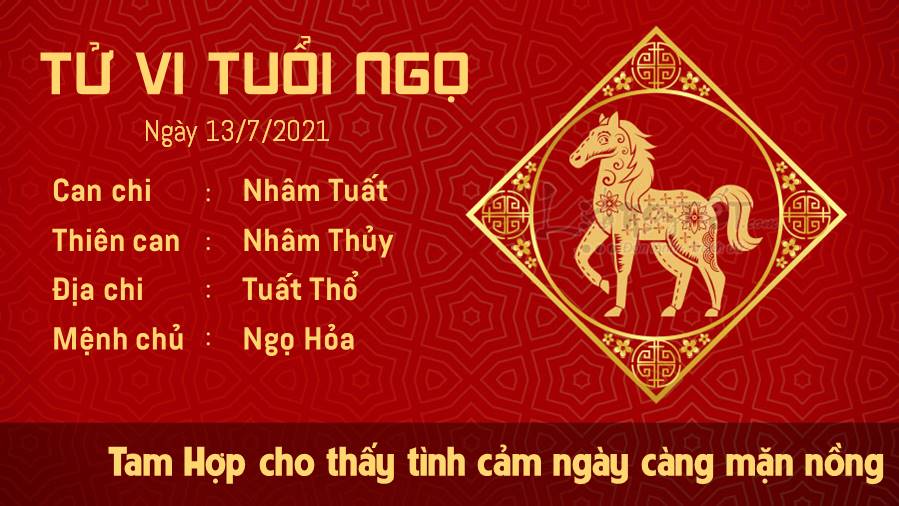 Tam Hợp cho thấy tình cảm hai người càng mặn nồng sau thời gian "thử lửa" khi có chút sóng gió, tình yêu hai bạn như được đặt lên bàn cân và có thêm cơ hội thử thách niềm tin cho nhau. Bạn và người ấy dần chấp nhận một số mặt chưa tốt của nhau để cùng giúp nhau hoàn thiện bản thân hơn. Sự cố chấp của tuổi Ngọ được tháo bỏ khi trong ngày Chính Tài có người chỉ cho bạn những khái niệm hay ho về tài chính, tiền bạc mà lâu nay bạn hiểu nhầm và thường có quyết định sai lầm. Thổ - Hỏa tương sinh mang tới những tin vui liên quan tới sức khỏe, nếu ai đang chữa bệnh thì lúc này nhanh hồi phục.