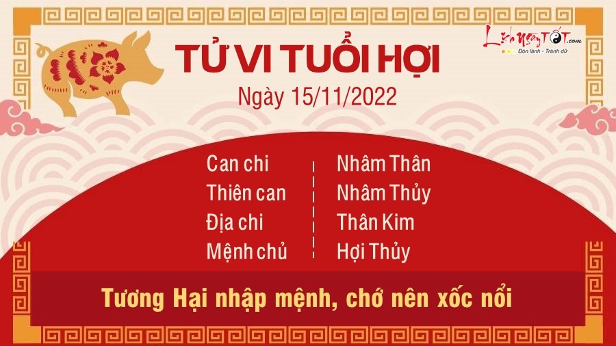 Thân Hợi Tương Hại nhắc nhở tuổi Hợi chớ nên hành động vội vàng, xốc nổi trong hôm nay kẻo tạo điều kiện thuận lợi cho tiểu nhân có cơ hội quấy phá dẫn đến thất bại. Trong bất cứ vấn đề nào, bạn cũng nên tìm hiểu kĩ nguyên nhân, gốc rễ của vấn đề, giữ sự bình tĩnh và sáng suốt cần thiết để đưa ra những phương án chính xác. Ngũ hành tương sinh giúp tình yêu của bạn rất tuyệt vời dù đôi lúc bạn quá bận rộn công việc mà vô tâm với người ấy. Chỉ cần bạn vẫn luôn chân thành và một lòng hướng tới đối phương, sẵn sàng bù đắp ngay khi có cơ hội thì chuyện tình cảm đúng là không còn gì để chê cả. Ngày 15/11/2022 tức ngày 22/10 âm lịch, nhân thần ở phía ngoài khớp cổ chân, mép tóc, mắt cá ngoài chân. Bạn tốt nhất tránh mọi sự tổn thương, va chạm, mổ xẻ, châm chích tại vị trí này.