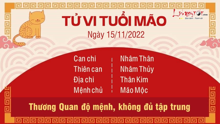 Thương Quan xuất hiện trong tử vi hàng ngày của tuổi Mão có thể là nguyên nhân khiến con giáp này dễ bị xao nhãng, đầu óc không đủ tập trung để giải quyết công việc, dẫn tới tiến độ trì trệ, việc dồn việc. Chính vì điều này mà bạn có dấu hiệu thụt lùi hơn so với mọi người, lúc nào cũng trong tình trạng bận rộn nhưng hiệu quả không cao. Ngày này bản mệnh cũng cần phải tỉnh táo hơn trong chuyện làm ăn kinh doanh. Nếu có cơ hội đầu tư thì cũng cần phải xem xét kĩ càng trước khi đổ tiền vào đó, đừng manh động, vội vàng mà mắc bẫy kẻ xấu. Tiểu nhân có thể chỉ đợi khi bạn chủ quan để lợi dụng, chiếm đoạt tiền bạc của bạn. Hôm nay còn là ngày Kim khắc Mộc, tuổi Mão không gặp may ở phương diện tình cảm. Nếu còn độc thân, cơ hội để bạn gặp được đối tượng ưng ý vẫn chưa đến đâu. Bạn cảm thấy thất vọng vì sự lận đận của mình. Nhưng chuyện tình cảm thì chẳng thể vội vã được, hãy dành thời gian yêu thương và hoàn thiện mình hơn.
