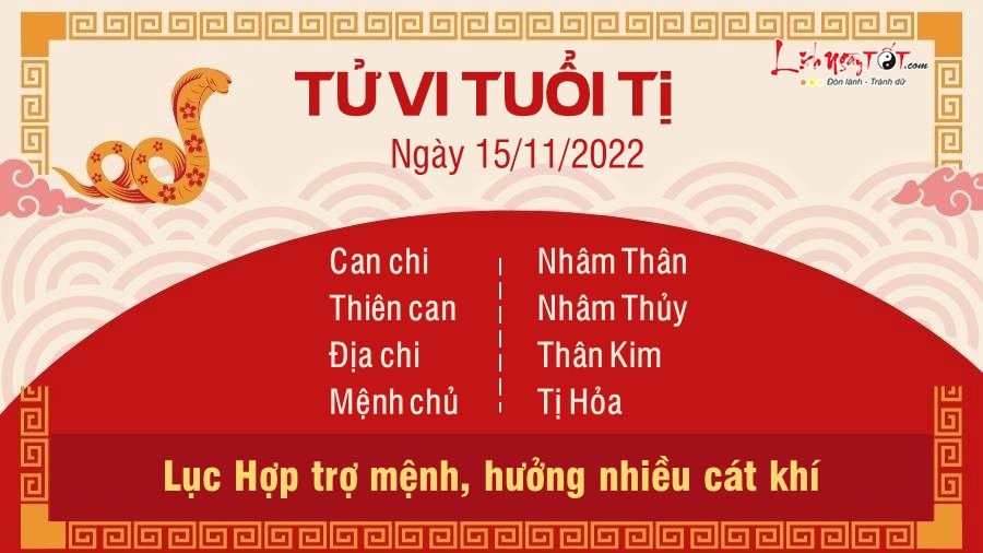 Người tuổi Tị được hưởng nhiều cát khí trong ngày Lục Hợp độ mệnh. Các kế hoạch công việc mà con giáp này đang tiến hành đều mang tới kết quả như ý. Bạn cũng được cấp trên cất nhắc và đối tác, khách hàng tin tưởng nên đạt được thành tích rất cao, có thể nắm giữ được những vị trí quan trọng trong công ty. Tài vận hanh thông, làm đâu lợi đấy, tiền bạc thu về ngoài sức mong đợi. Các khoản đầu tư bắt đầu thu về lợi nhuận nên chuyện tiền bạc không phải lo lắng quá nhiều. Bạn có thể nhân đà này thực hiện những ý tưởng mở rộng quy mô mà bản thân đã ấp ủ từ lâu, nếu biết tận dụng thời cơ thì sẽ có tiến xa hơn nữa. Vận trình tình cảm tuy không có sóng gió nào quá lớn, tuy nhiên cũng có lúc tuổi Tị cảm thấy mối quan hệ của mình không được ngọt ngào và lãng mạn như người khác. Thực ra vấn đề nằm ở chính suy nghĩ của bản thân bạn nên hãy tự hâm nóng mối quan hệ, đừng tự gây áp lực cho chính mình nhé.